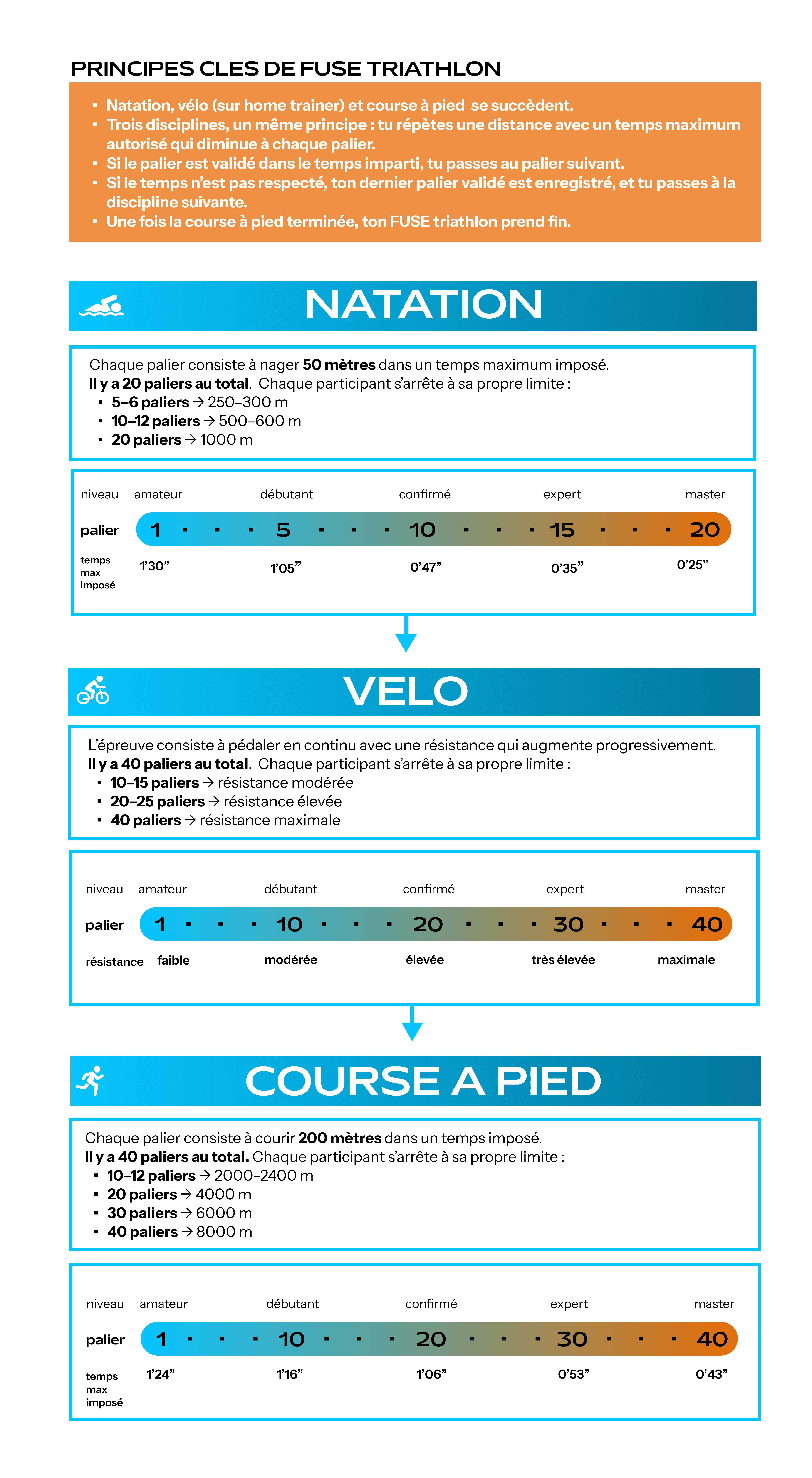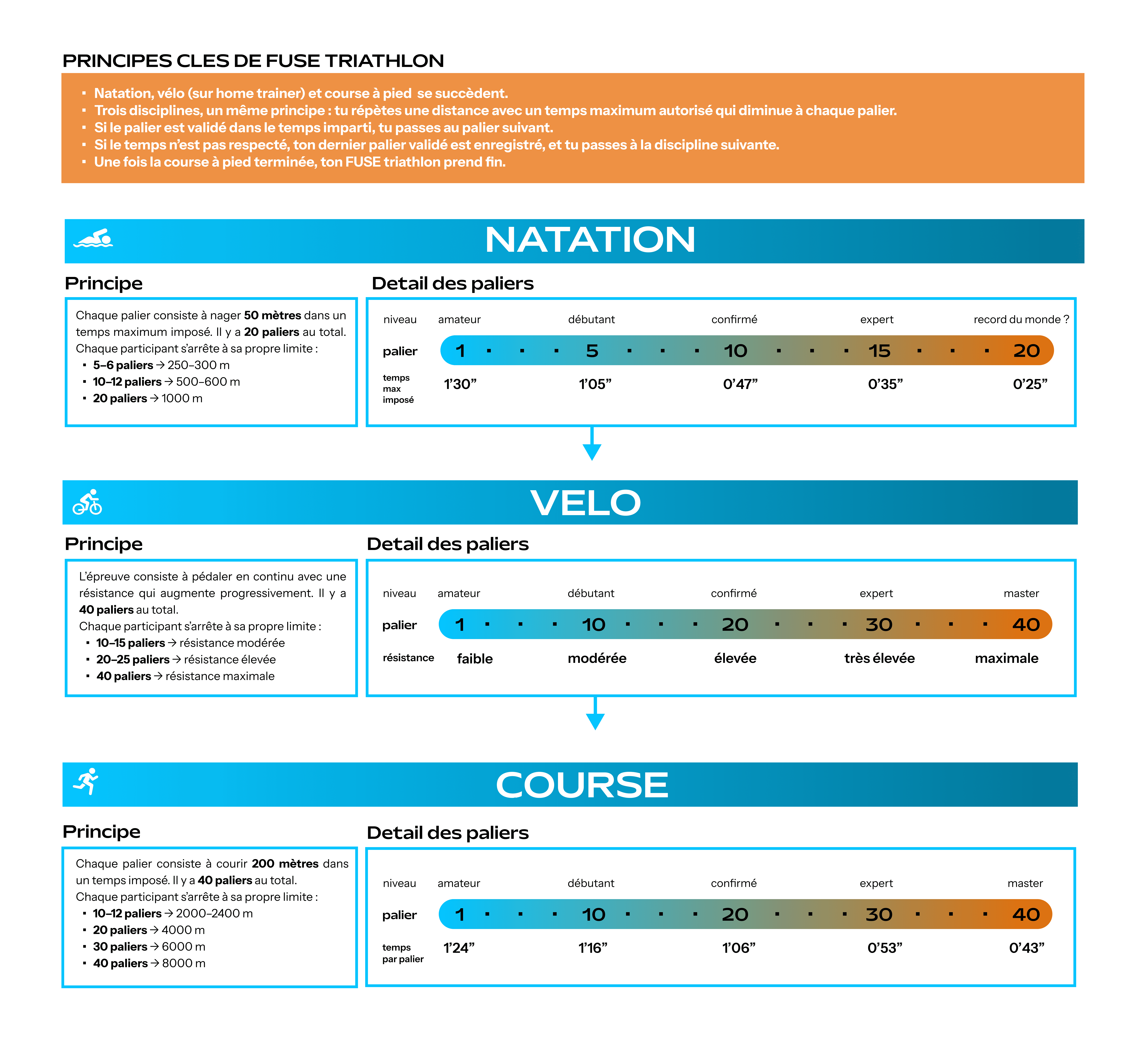 Les départs se font par vagues, répartis tout au long de la journée, pour permettre à chacun de se concentrer sur son effort porté par l'énergie du public. Chaque palier franchi ajoute des points à ton score final : celui que tu reviendras battre à la prochaine édition de Fuse.